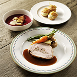 「ダッチー・ティールーム」で提供する「ダッチーオータムセット」(パン付き)は、チェダーチーズ入りビーツスープ、コニャック風味のフルーツ入り豚挽肉の豚肉ロール巻き、プチシューのレモンカードクリーム詰めのコース料理