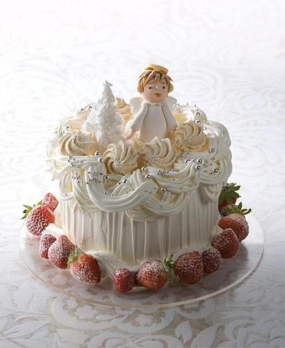 ウエディングケーキの先駆者でもあるパティシエ、本橋雅人さんによるクリスマスケーキは、ふんわりとしたスポンジ生地になめらかな口どけの生クリームとイチゴを重ねた、愛らしく華やかなデザイン。
