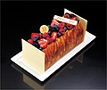 モダンな建築物をイメージし、チョコレートババロアにマンゴー&パッションクリームを組み合わせ、甘酸っぱいフランボワーズソースをアクセントにデコレーション。