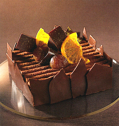スポンジ生地はアニスで香り付けし、紅玉りんごのソテーをミルクチョコレートムースでコーティング。真上から見るとスターの形をした「芸術的」なケーキ。
