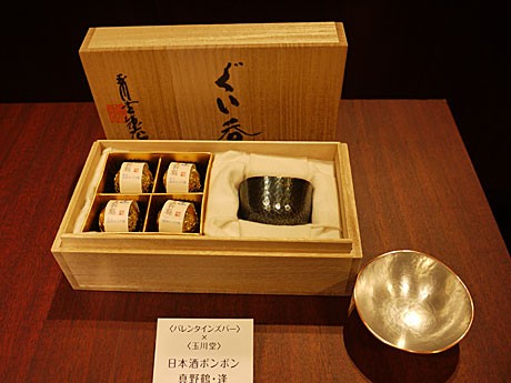 日本橋三越本店の2014年バレンタイン商品。バレンタインオリジナルの酒器付き「日本酒ボンボン 真野鶴・逢」(2013-12-26)