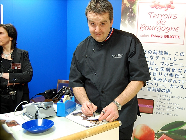 仏・ディジョンにある「ファブリス・ジロット」のオーナーショコラティエ、ファブリス・ジロットさん。サインの最中にカメラを向けると、こちらに向かってニッコリ。お隣にいらっしゃるのはジロットさんの奥様。(2007-01-24)